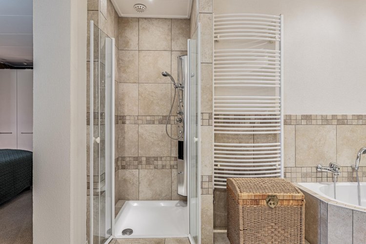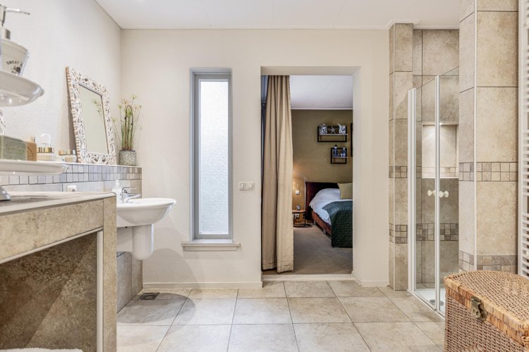 Naast de woonkamer zit de woonkeuken met eetgedeelte en voorraadkelder. De woning is uitgebouwd in 2003 wat zorgt voor een royale woonkeuken met schiereiland en diverse inbouwapparatuur. Naast de keuken zit een bijkeuken met aansluitingen voor de wasapparatuur. De grote slaapkamer met badkamer bevindt zicht naast de keuken. Een zeer royaal vertrek in deze woning.