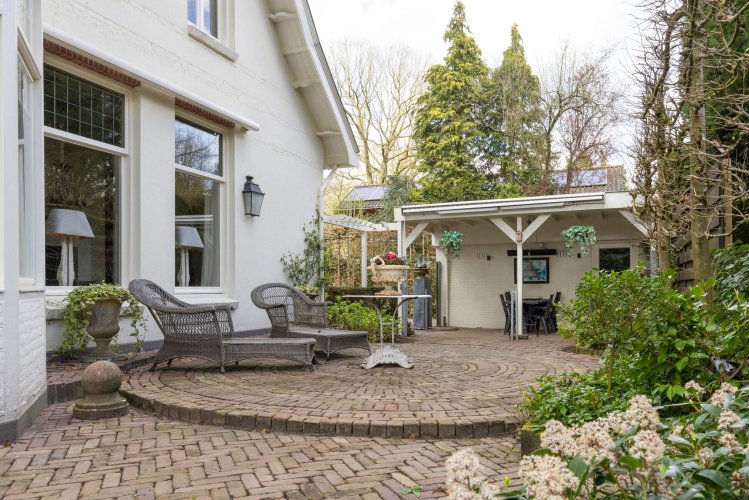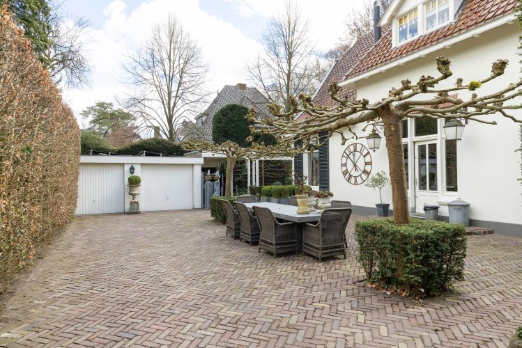 Schuin achter het huis staat een dubbele garage, voor twee auto’s. Aan de garage is een veranda gebouwd, voorzien van warmtestraler en zonnescherm. Het terras ligt zowel aan de oostkant van het huis (keukenzijde) als aan de zuidkant (serre van de zitkamer). Op eigen terrein – met ingang aan de Rubenslaan-zijde – kan met gemak een 2-tal auto’s geparkeerd worden, via de Van Ostadelaan is het perceel ook met de auto toegankelijk.